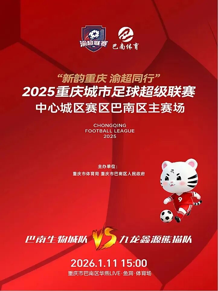 1月11日15:00,“渝超”巴南生物城队将在华熙LIVE·鱼洞·体育场,对战九龙鑫源熊猫队。门票预售将于1月5日上午11时16分开启,点击上方图片即可预约购票。
