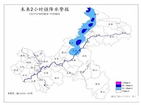 重庆气象台7月17日15时50分发布未来2小时强降水警报:预计7月17日15:50-17:50,忠县、梁平、万州、开州、城口等5个区县小时雨强将达 30-50 毫米,丰都、巫溪、石柱等3个县小时雨强将达10-30毫米,上述地区局地伴有雷电、雷雨大风,请注意防范。