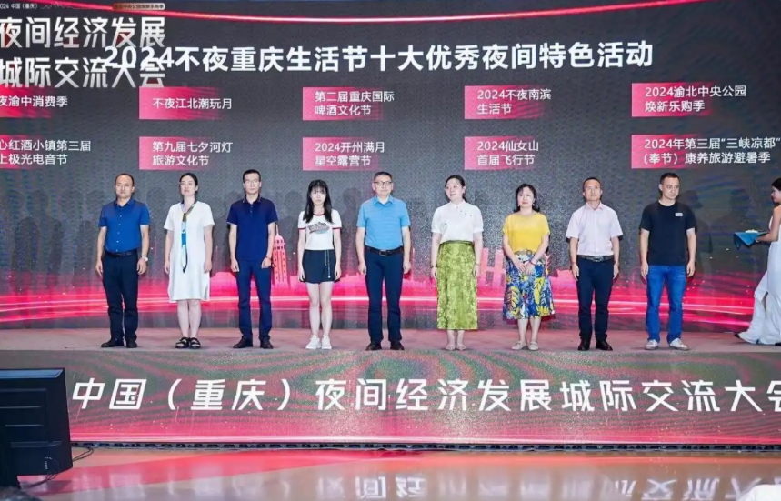 日前,2024中国(重庆)夜间经济发展城际交流大会举行。活动现场,主办方颁发了2024不夜生活节收官评选出的“2024十大优秀夜间特色活动”“2024夜间潮玩圣地TOP10”等多个奖项。