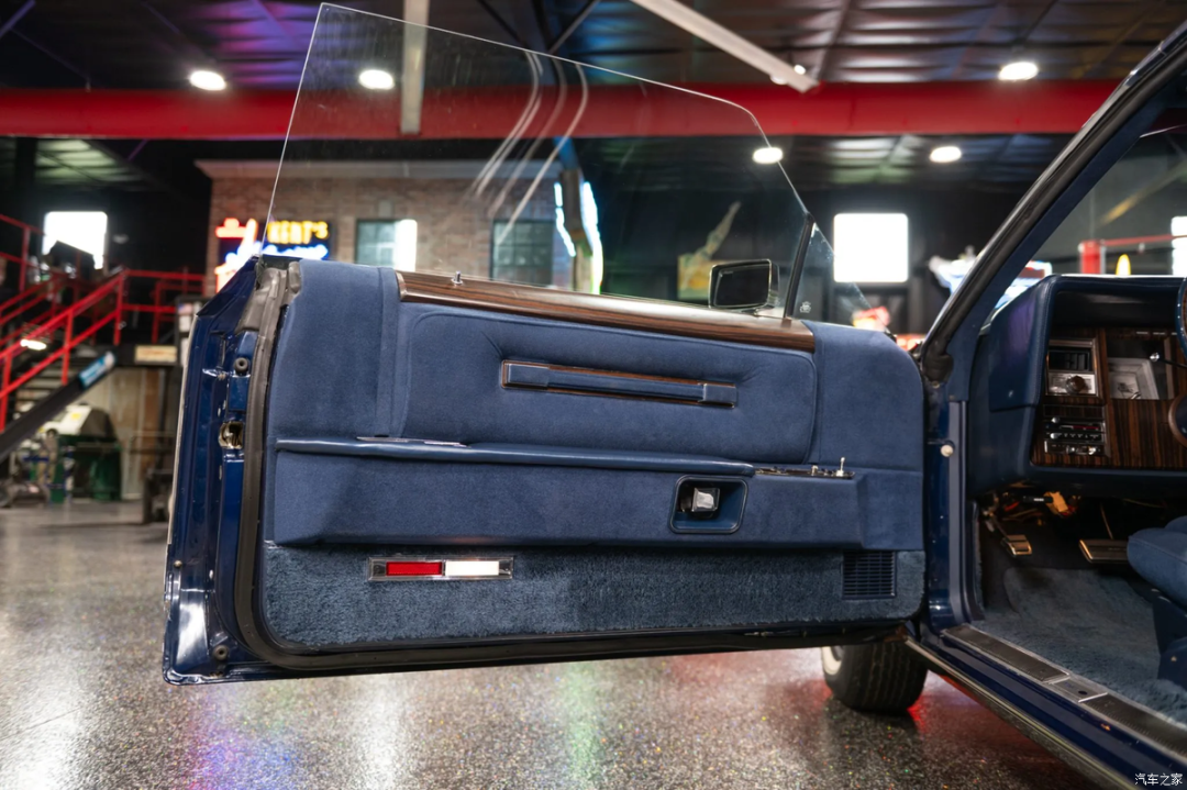 车内同样采用午夜蓝配色,电动调节的丝绒大沙发座椅看着就很舒服,车内随处可见的木纹饰板同样诠释何为美式豪华。配置方面,电动车窗、自动空调、定损巡航和八轨四声道AM/FM立体声收音机,对于这辆70年代末的美国车来说已经很顶了,当然还有那块卡地亚时钟。